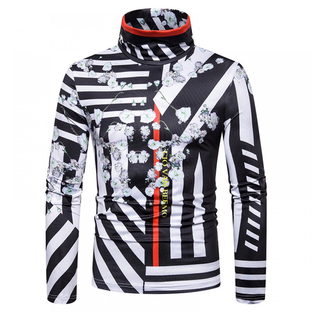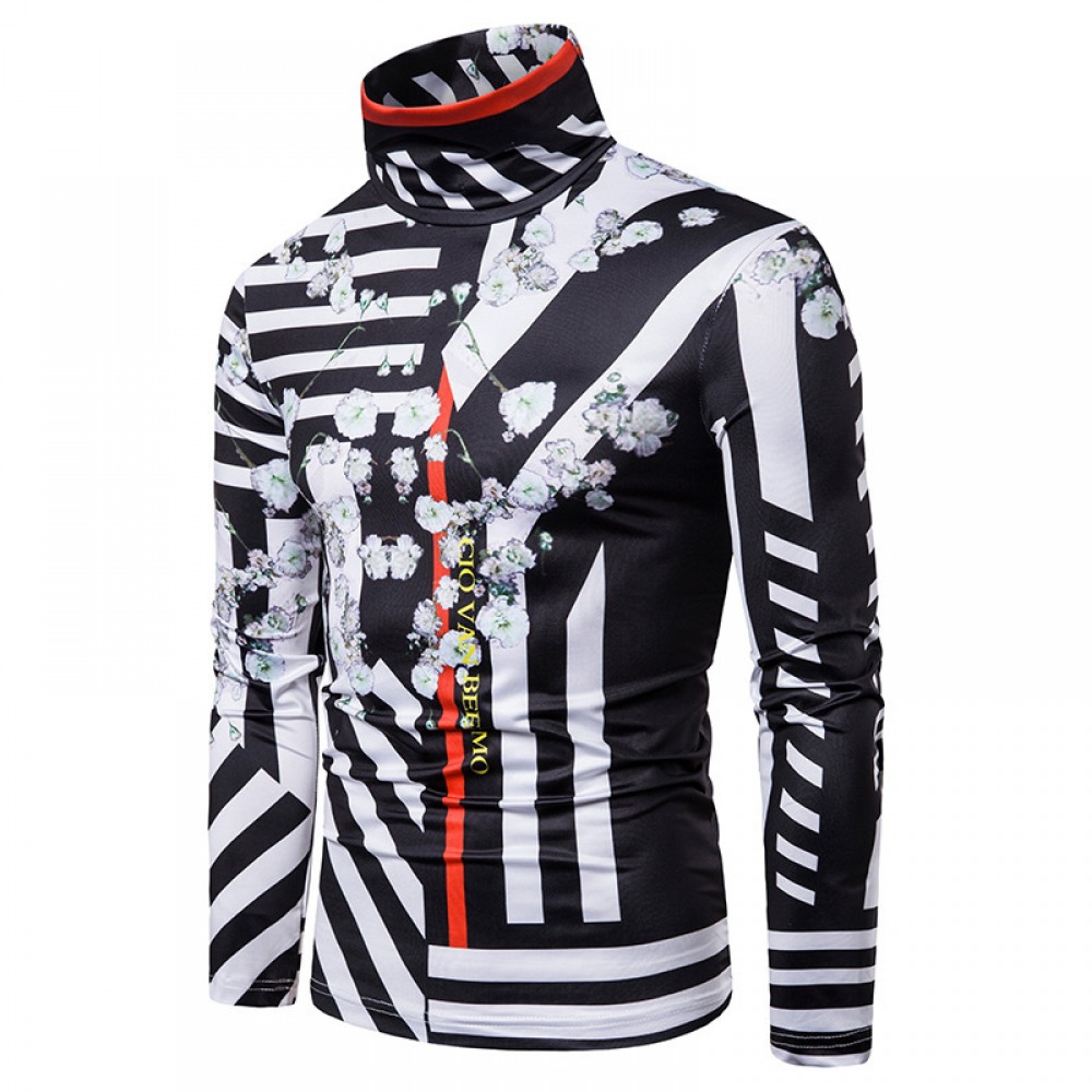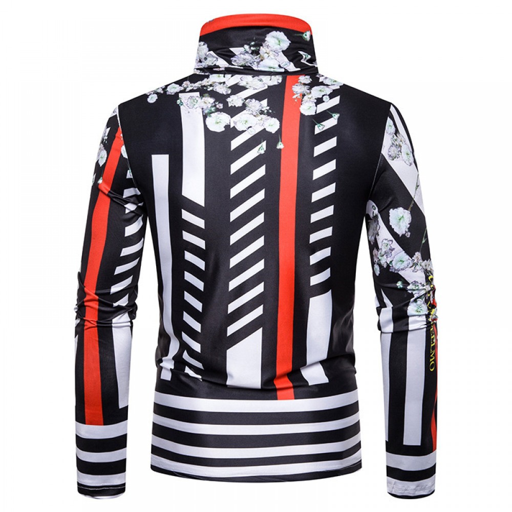New Men's Large Size 3D Flower Stripe Printing High Neck Long Sleeve T-Shirt Bottoming Shirt